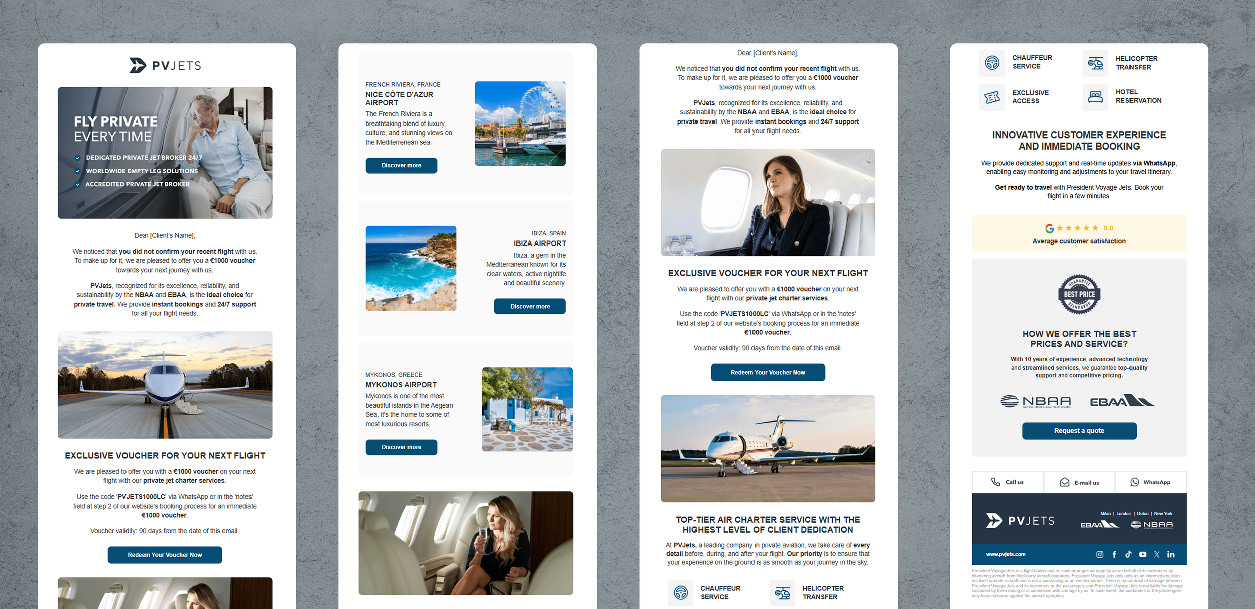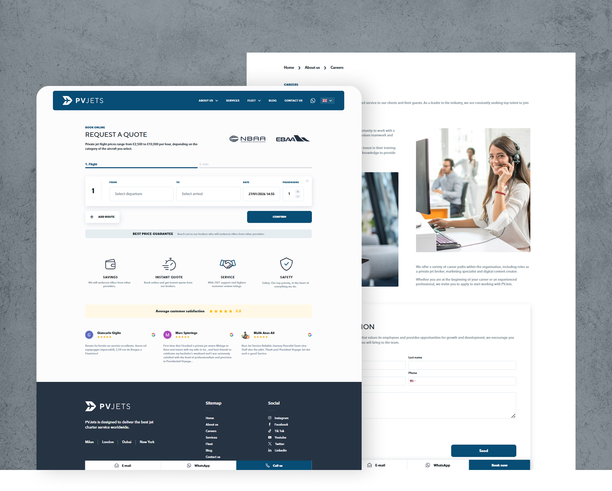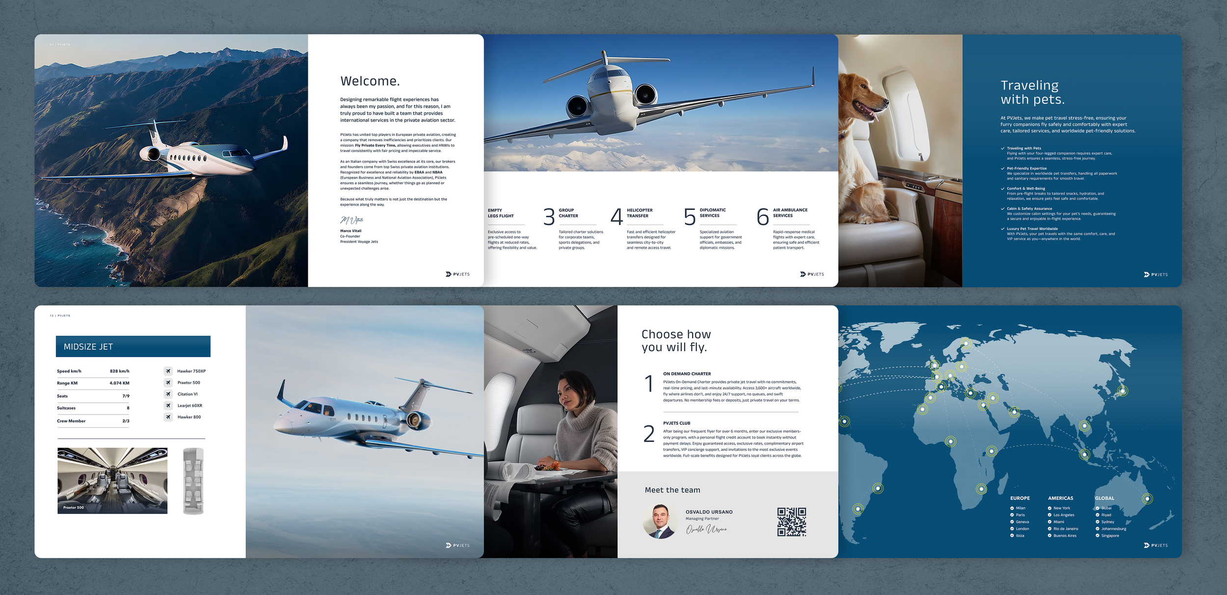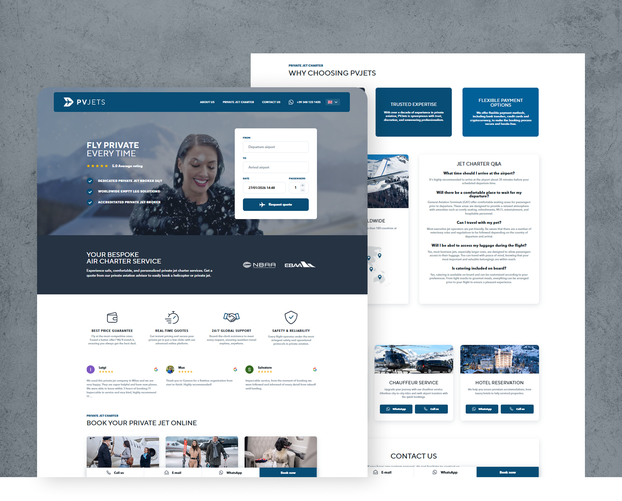 PVJets is a global private aviation brand providing tailored jet and helicopter charter services, managing over 1,000 passengers and 3,500 flight requests annually with a focus on safety, comfort, and premium service.